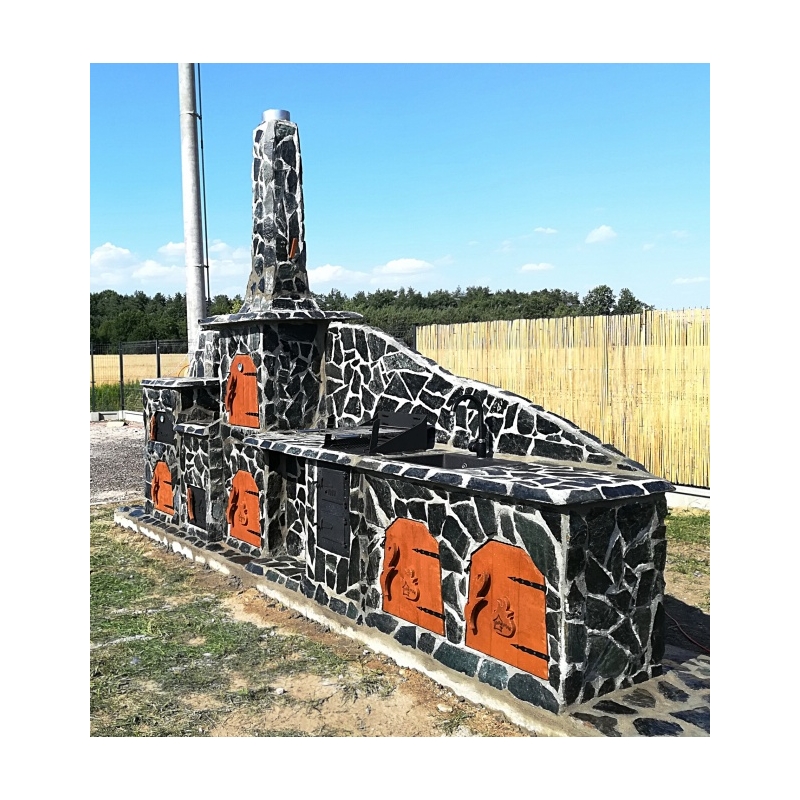 Kõik väliköögi ahjukomplektid on standardina kaetud pruunikas-halli jõekiviga.